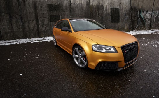 The latest project car by SchwabenFolia is a unique Audi RS3 which they have wrapped in a color they refer to as G(old) Orange. It’s just a matte orange garnished with matte black grille, spoilers, and mirror caps, as well as blacked-out lights. And it looks pretty cool.