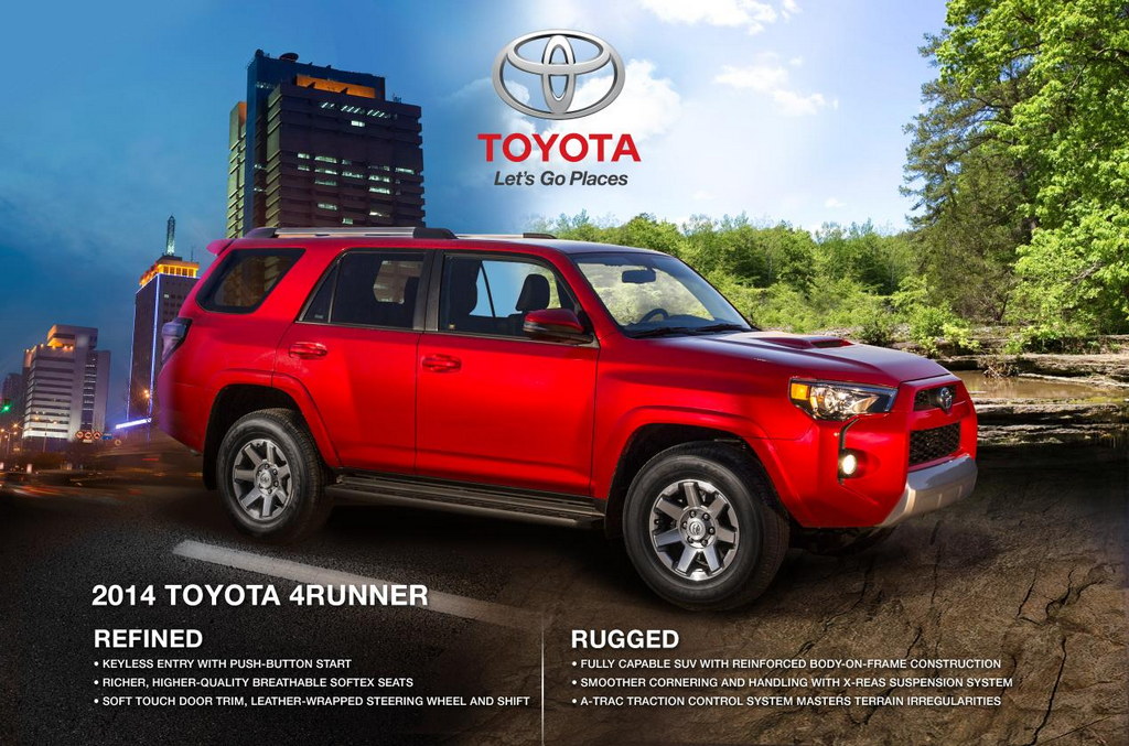 Visually, the car comes with a new design that is not particularly pretty, but reflects its ruggedness with features like a muscular front grille, buffed up fenders, and smoked headlamps. 2014 4Runner is available in three grades: a well-equipped, value-driven SR5; top-of-the-line Limited, and a Trail grade version customized for off-roading.
