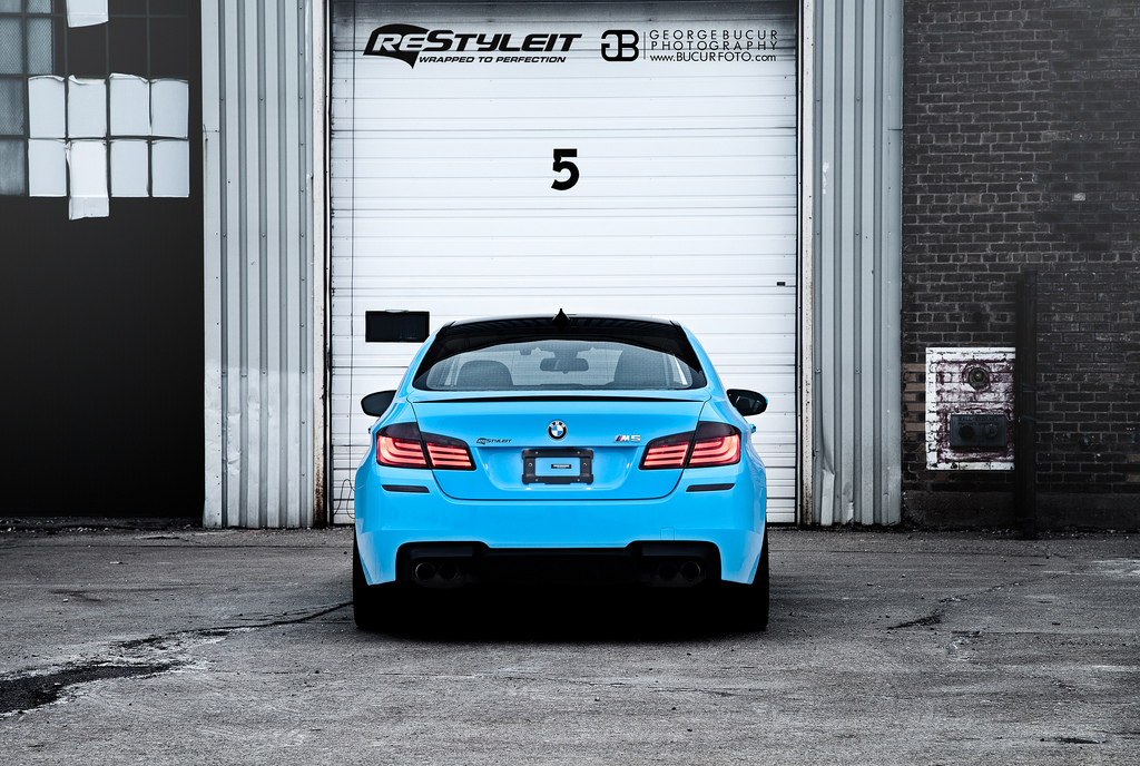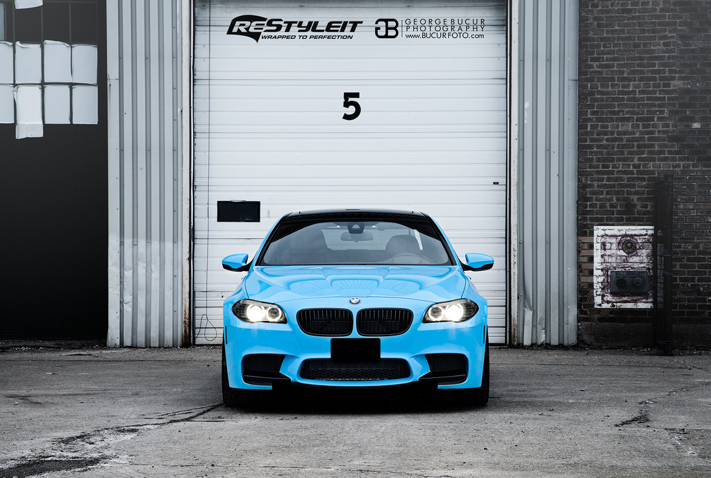 Toronto-based wrapping expert ReStyleIt has come up with an interesting treatment for a BMW M5 F10. They wrapped the car in a special Olympic Blue film, complemented by black aero parts and black wheels. As is the case with such works, pictures don’t really do the justice and you have to see it in person. But it does seem pretty cute. Not exactly manly and aggressive enough for a car like the M5, but very unique.