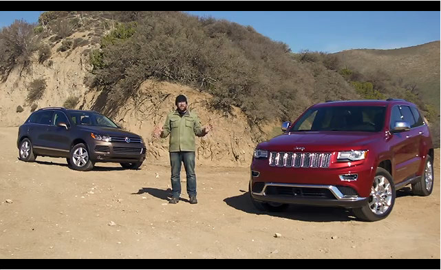 That little man in green you see above is MotorTrend’s Jonny Lieberman who on this episode of his Head 2 Head show gets two diesel-powered SUVs seriously dirty. The goal here is to find out which of these 55 grand oil-burning, hard-working SUVs are better at tackling an off-road course, and which is better at being a car for every opportunity. It’s the 2014 Jeep Grand Cherokee EcoDiesel vs 2013 Volkswagen Touareg.