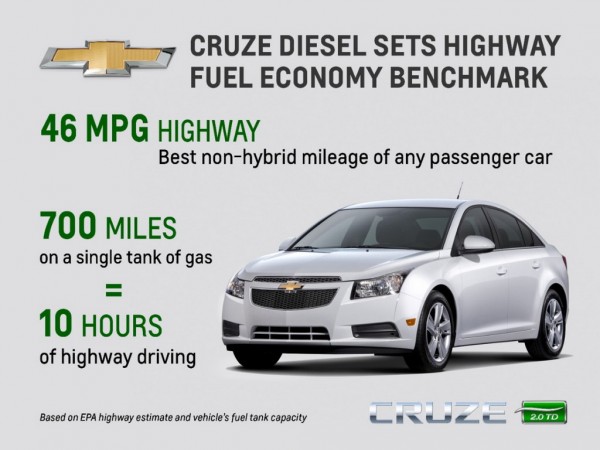 Chevrolet announced the official fuel economy ratings for the diesel version of their best-selling sedan, the Cruze, and they are claiming some big numbers. The car does an EPA-estimated 46 MPG on the highway, which means on a full tank of gas you can cover a distance of 700 miles between the pumps.