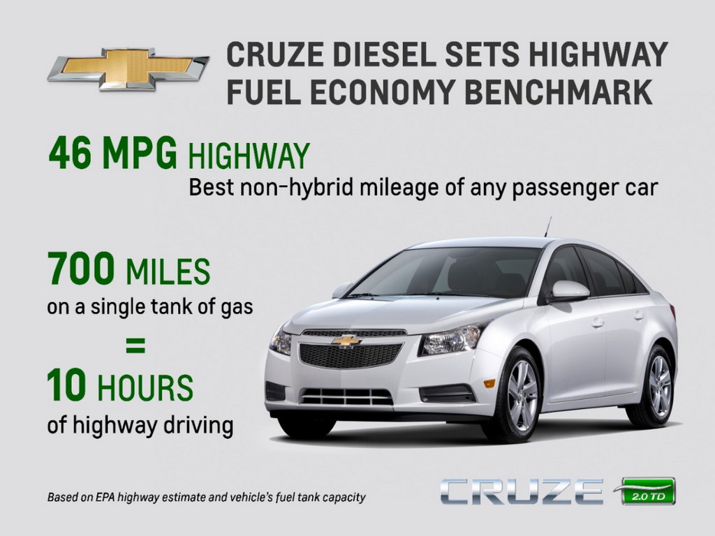 “We harnessed generations of diesel expertise to adapt our world-class global engine for the North American market,” said Gary Altman, chief engineer, Chevrolet Cruze Diesel. “The Cruze Diesel is the best diesel passenger car out there. Chevrolet is redefining the meaning of great fuel economy with this car.”