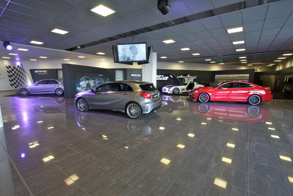 The Center also offers a nice and relaxing seating area for the visitor and customers with unique AMG features such as a larger than life engine badge on the wall to communicate the “one man – one engine” philosophy, and TV screens showing what is going on inside the AMG factory.