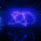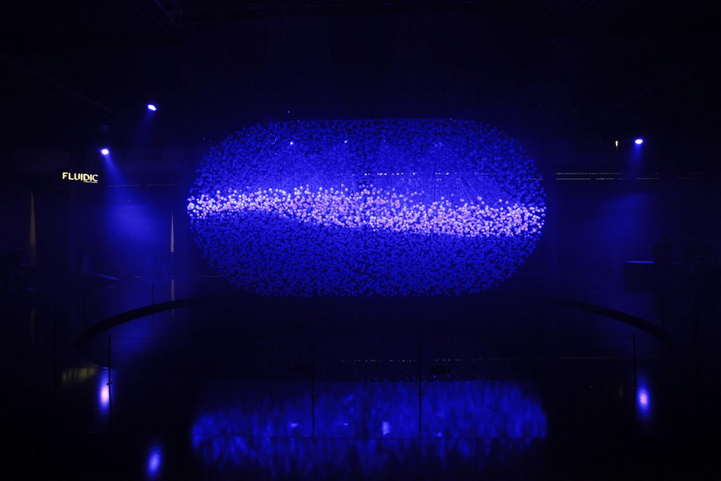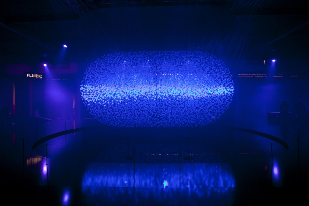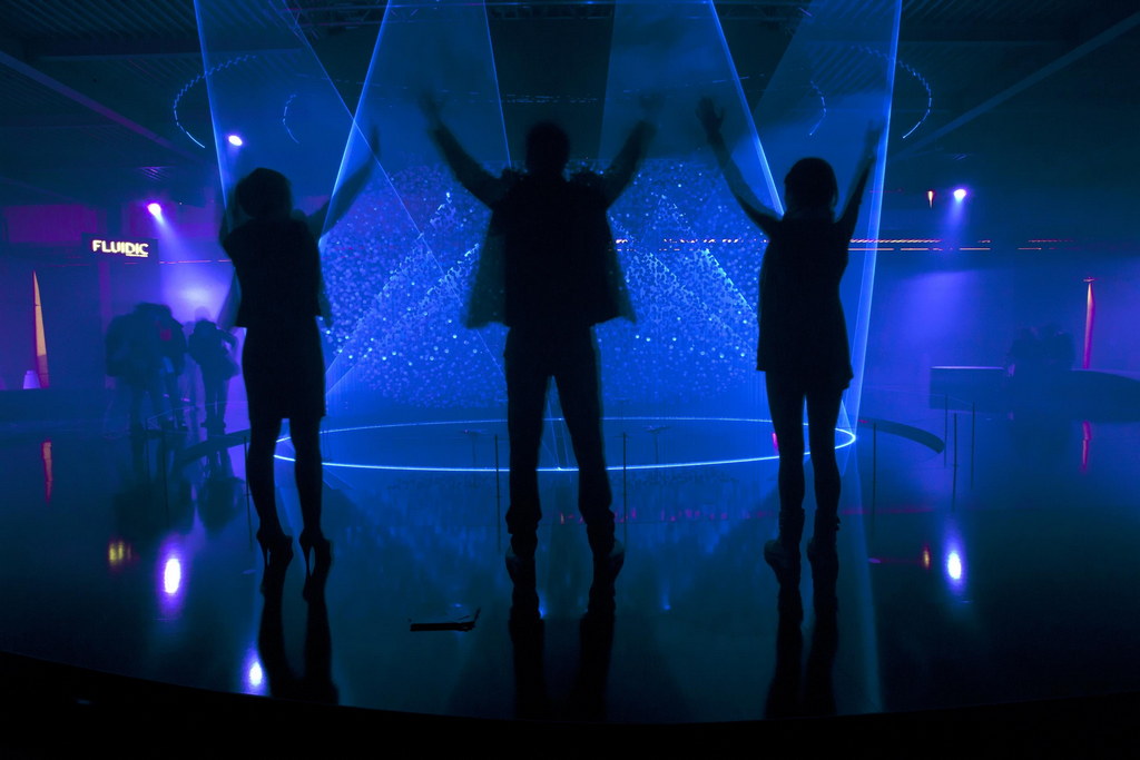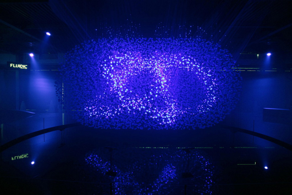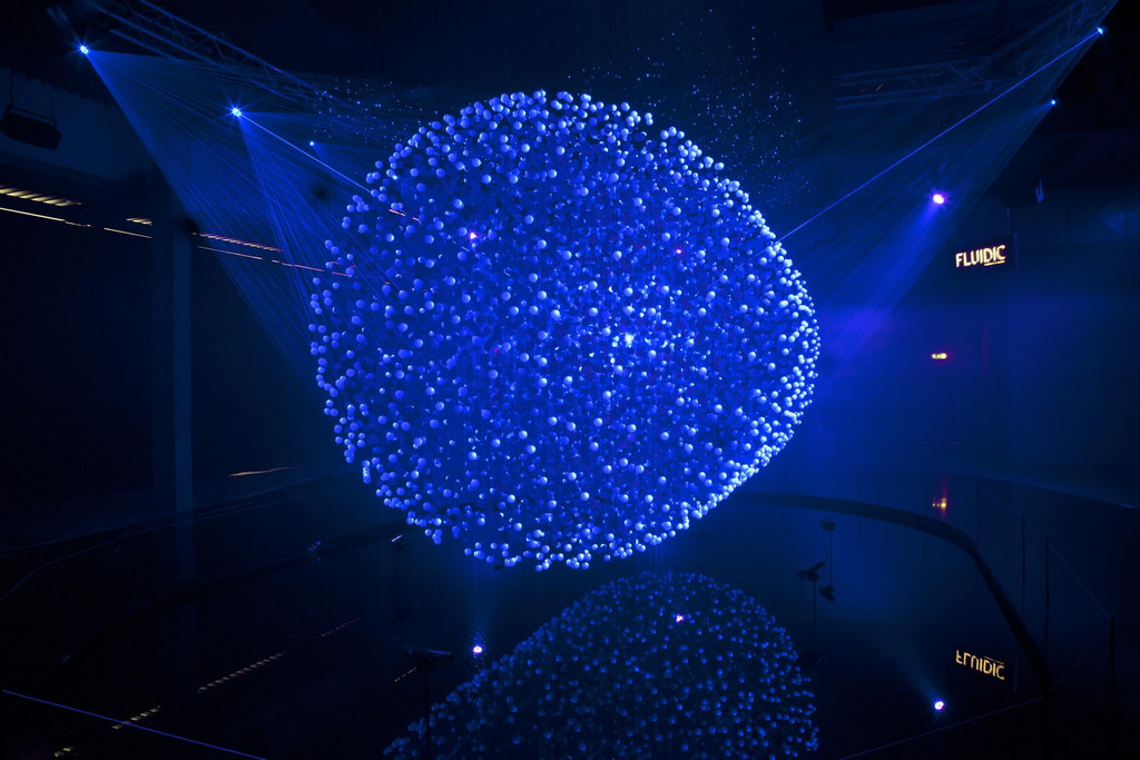 Occupying 1,000 square metres, the light sculture is made up of 12,000 translucent spheres, acting collectively as a screen, surrounded by eight high-powered lasers and suspended over a pool of water. It even uses a special 3D scanning system that registers body warmth, allowing visitors to explore and manipulate the installationby usingtheir gestures to createcurves and shapes. That is pretty cool.