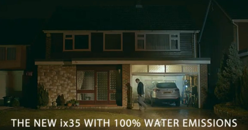 The controversial commercial is about a miserable fella trying to off himself using the old exhaust pipe trick, only to realize the car is actually a fuel cell and only emits H2O, which is water. Come to think of it, maybe he made the right decision!