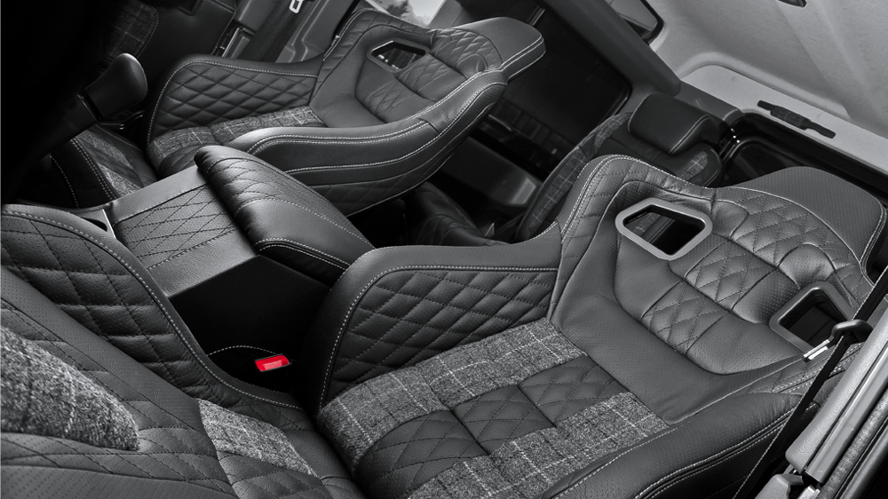 The thorough Wide Track packge o this car consists of front & rear wide wings with integrated vents & bolt apertures, hardwearing mud flaps, front grille with embossed Kahn branding & mesh, bonnet vents with mesh, xenon crosshair headlights, side vents with mesh, roof in satin black, Kahn oval tailgate badge, brake calipers finished in liquid red, extended wheel arches in satin black and front, rear wing vent mesh inserts, undercar Kahn logo projection floor light and the customary Chelsea Truck Company spare wheel cover.