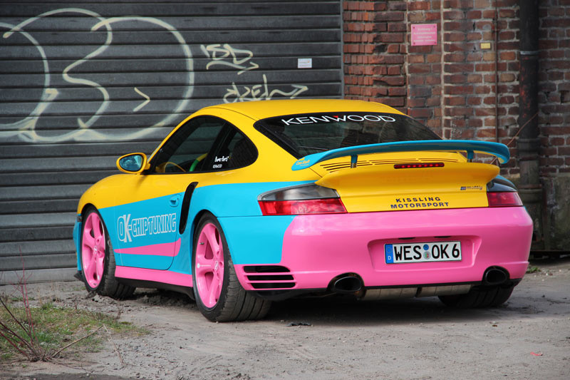 To help the 996’s old chassis cope with the new-found power, they also installed KW-Coilover Suspension version 3, a Techart rear spoiler, and Techart 19-inch wheels with 235/35-19 and 305/30-19 tires front and rear. As part of the Manta treatment, the wheels are painted pink.