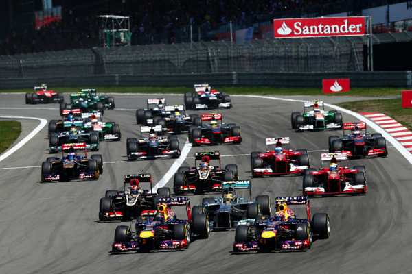 As the lights turned green at the Nurburgring, pole-sitter Hamilton bogged down which allowed Sebastian Vettel to get alongside him, with Mark Webber also jumping on the Mercedes’ bad fortune. Hamilton was squeezed out and Vettel led into Turn One from Webber, with Hamilton knocked back to third.
