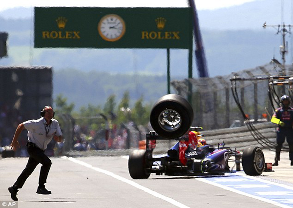 Although Webber kept his teammate in check, he pitted for a new set of tyres on Lap 9 with the possibility of rejoining ahead of Vettel but there was a typical moment of Webber bad luck – the pit crew couldn’t get the right rear tyre on properly and when he pulled away it bounced across the pit lane and hit a cameraman. Later news informed that he was okay.