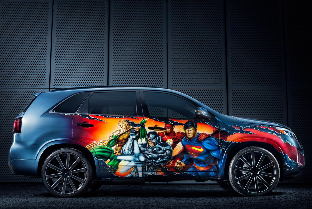 All the members of the Justice League – including Superman, Batman, Wonder Woman, Green Lantern, The Flash, Aquaman and Cyborg – have been featured on a differen Kia before, but this time and on this Sorento they all come together to wrap things up. They have been hand-painted and custom air-brushed by the guys at the world-famous West Coast Customs tuning center.