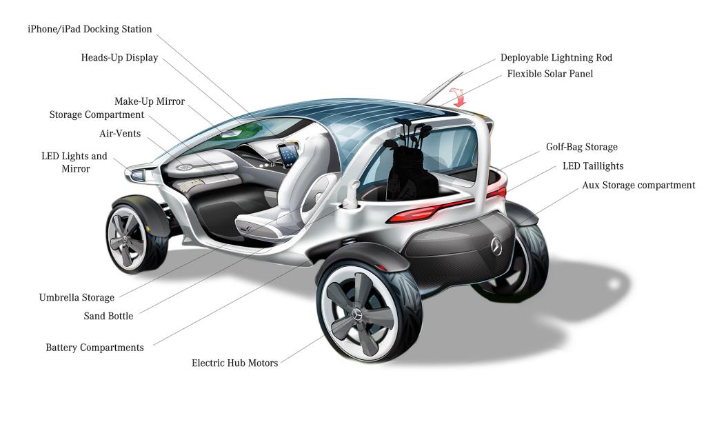 The cart boasts Mercedes-Benz design DNA with the diamond grille and unique front and rear lights. But there is more to it than just a three-star badge. It uses touch screen monitors, virtually all aspects of the cart can be controlled without extra buttons. It features a rotatable docking station for an iPad or iPhone and a USB interface, air-conditioning system, head-up display, music layer with loudspeakers, Bluetooth telephone, and AIRSCARF neck-level heating system, first introduced in 2011 in the new SLK Roadster.