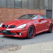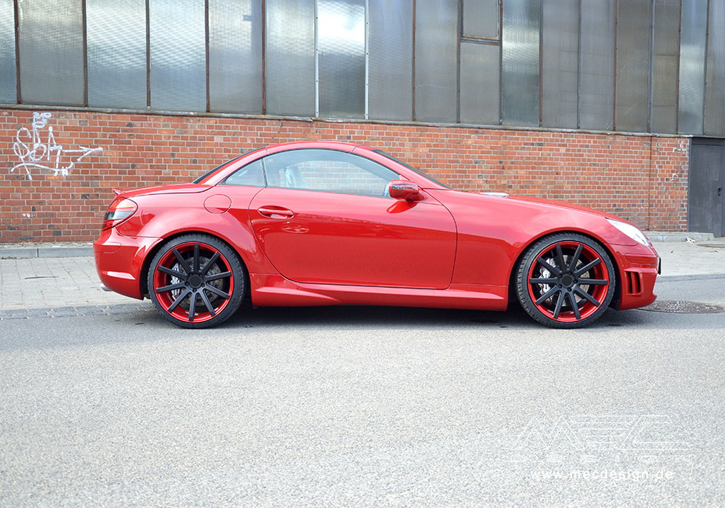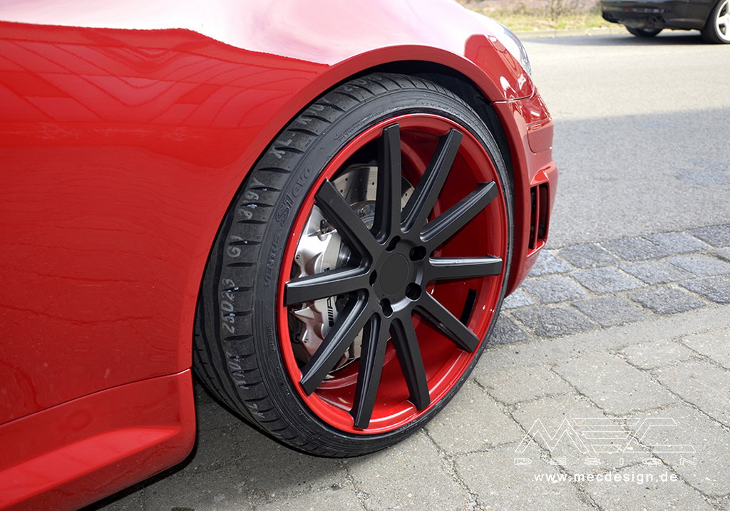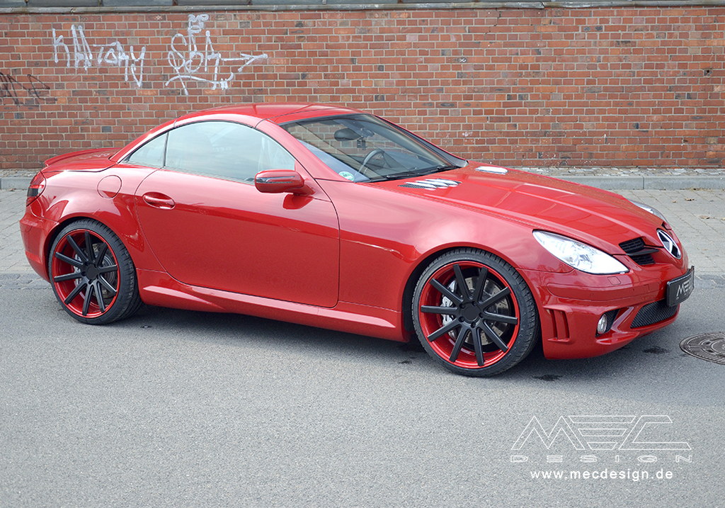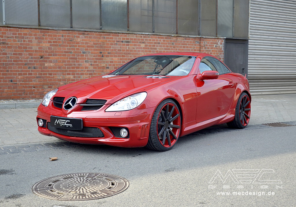 Anyways, let’s the R171 by MEC Design. The tuner has done many good things to the SLK55, improving its style, handling, and driving fun. The treatment begins with installing a set of ConDeni Nobilis 1 piece wheels. They measure 8,5×19 front and 9,5×19 rear, and have a special black finish with red lips that match the color of the exterior.