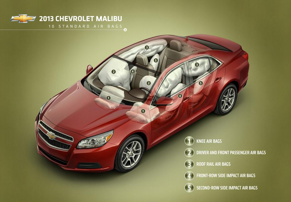 The body of the Malibu and its passenger cell feature ultra-high-strength steels, full-length frame rails, a reinforced safety cage and impact-absorbing crush zones. They are complemented with Dual-stage driver and front passenger air bags, Pelvic/thorax side-impact air bags for all outboard occupants, front and rear, Driver and passenger knee air bags, and Roof rail air bags with rollover protection.
