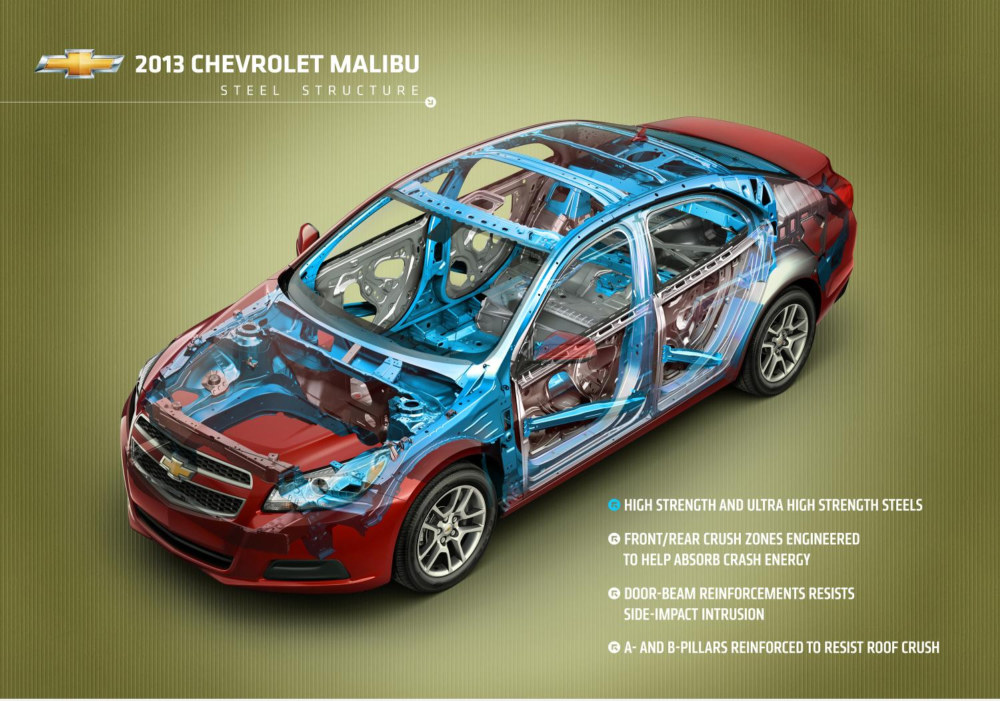 The 2013 Malibu can now add this certificate to its 5-Star Overall Vehicle Score from the National Highway Traffic Safety Administration and a 2013 Top Safety Pick by the Insurance Institute, as and other safety accolades it’s won in Europe, South Korea and Australia. The reason the car is so safe is partly because of its clever steel construction, and partly due to the sheer number of standard safety features.