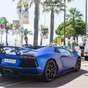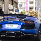 The matte blue color of this particular Aventador, complete with black roof panels, give it a very distinctive look.