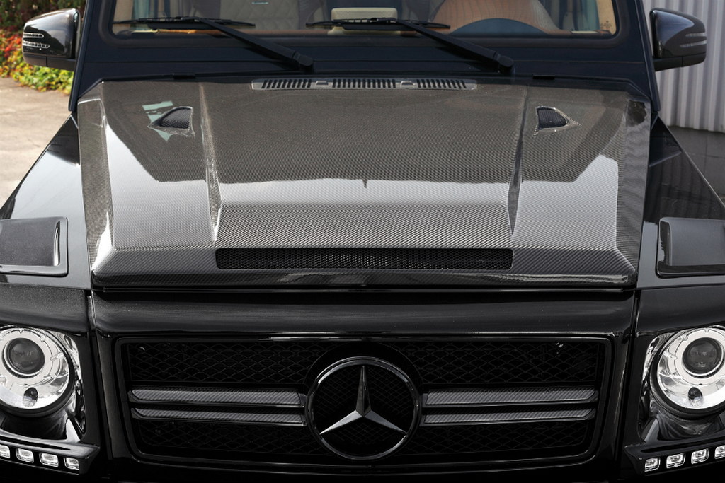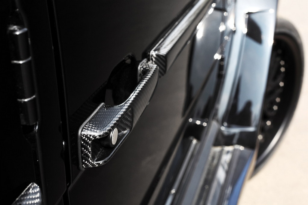 The treatment begins with bumper extensions at the front, complemented by LED lights, a blacked-out grille, carbon vented good, fender extensions, new side boards, triple exhaust with fancy new tailpipes, rear fenders, rear apron, rear spoiler, and wheel cover.