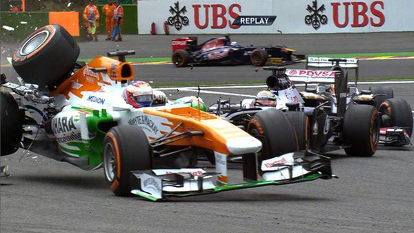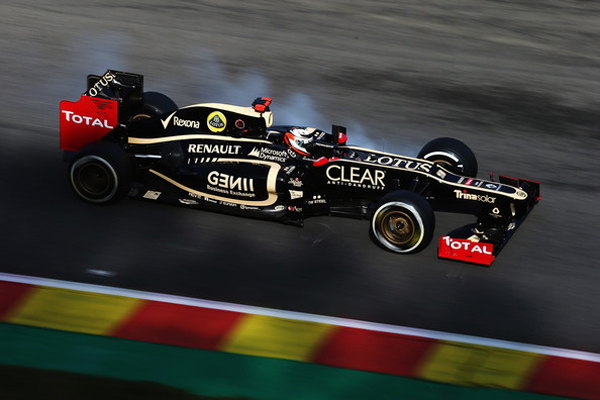 On lap 8 Sergio Perez put a brave move on Grosjean along the straight, and as the McLaren drifts left under braking, it catches the Frenchman out. The Lotus is forced to cut a corner at Les Combes. Perez eventually received a drive through penalty.