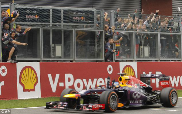 Lap 38 and Red Bull’s Vettel looked so comfortable up front with an 11 second lead over Alonso. Ferrari’s Massa passed Lotus’ Grosjean at the top of the straight into Les Combes for seventh place.