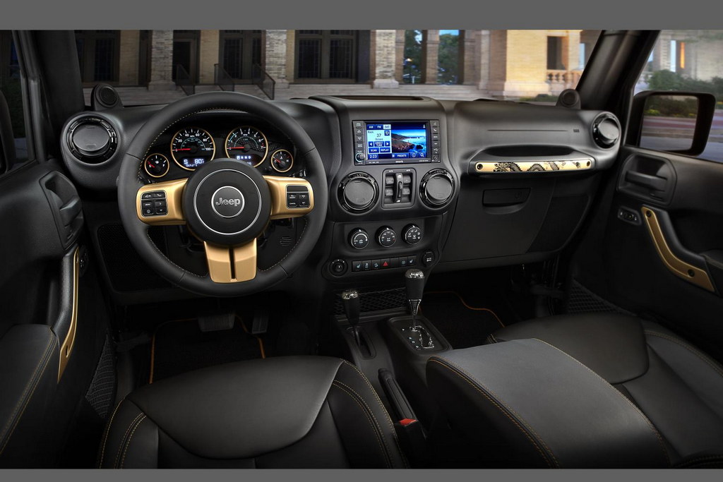 As for the features that set the 2014 Jeep Wrangler Dragon Edition apart, we have the Black paint job with a black body-color three-piece hard top, Bronze Satin Gloss details found inside the front grille slats, headlamp surrounds and on the Jeep badging, and a set of 18-inch black wheels.
