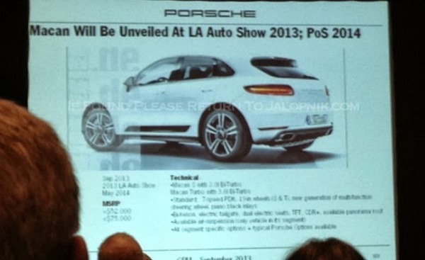 The spyshot you see above shows an official Porsche slide that indicates Macan pricing starts from $52,000 and goes up to $75,000. It probably means the car will launch in the U.S. with two engine options. The European model will also get a diesel variant.