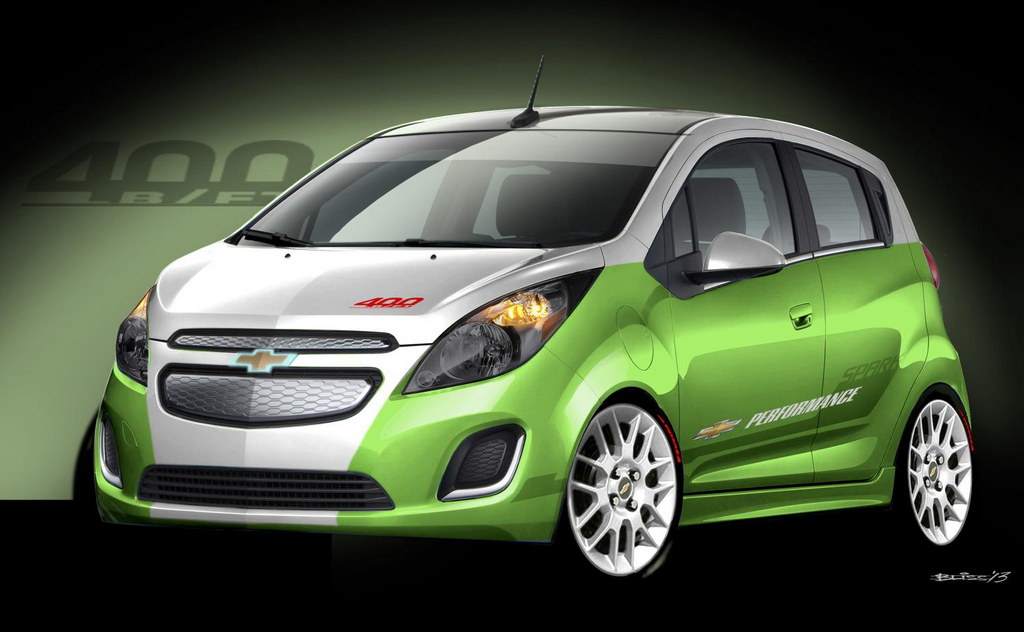 Then we have the Victory Red concept Sonic representing the available customization parts for the car. They include lots of chrome parts for door handles, liftgate and mirror cap trim, exterior graphics package, sill plates and all-weather floor mats, footwell lighting system, and Kicker audio system. In terms of performance, you get Chevrolet Performance suspension kit, brake package, and 18-inch wheels. The Spark EV also gets a Tech Performance treatment, with a unique backlit Chevrolet “bowtie” emblem in the grille and performance billet aluminum wheels, sill plates, floor mats and pedal covers, and body-colored trim plates and green stitching on the shifter boot and steering wheel, as the main highlights.