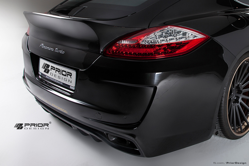 Prior Design Porsche Panamera kit includes a 3,490 EUR front bumper, a 2,990 EUR rear bumper, a set of side skirts that cost 1,990 EUR, a sport bonnet for 3,990 EUR, and a trunk lid spoiler, which at 999 EUR is the cheapest part of them all.