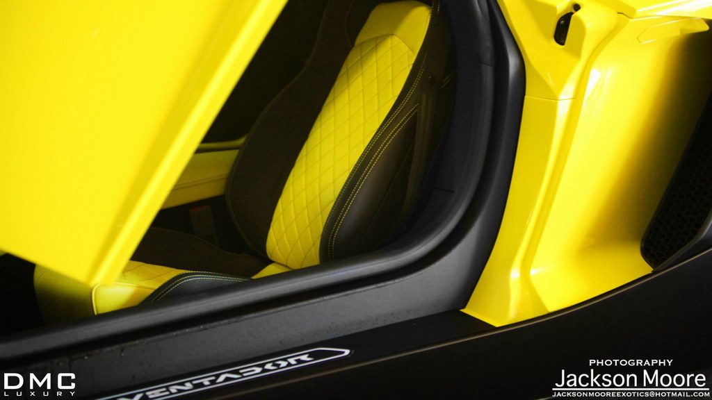 This DMC Lamborghini Aventador LP720 50th Anniversario Edizione also gets complete front and rear aero parts from factory with carbon fiber front spoiler and a pretty unique carbon rear diffuser. The clear carbon finish of these parts goes really well with the Giallo finish of the exterior, especially as the same theme is used on the inside. This is one unique bull.