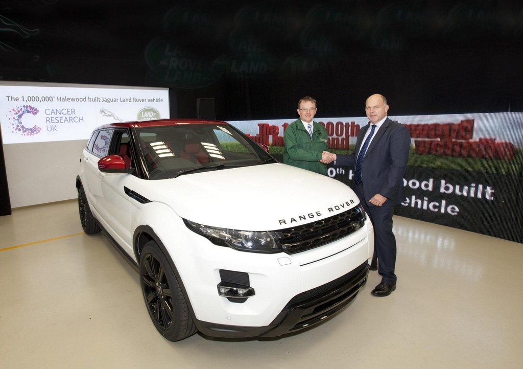 The 1,000,000 vehicle is a unique Range Rover Evoque, painted in a special one-off colour combination of Fuji-White, Dynamic with ebony-black alloy wheels and distinctive and unique Firenze-Red contrast roof and mirror caps, as well as red/black sports seats and interior door panels. It won’t be sold, but rather donated to Cancer Research UK and will be auctioned to raise money for the institute in 2014.