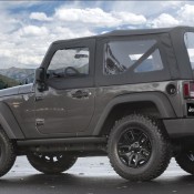 Naturally, the car’s exterior is styled to represent the features of the original Willys, with a gloss black grille with black Jeep badge, gloss black front and rear bumper appliques, historic satin black “4 Wheel Drive” rear tailgate decal and “Willys” hood decals and unique high-gloss black 17-inch aluminum wheels. You get different options for the top, including a Sunrider soft top and black-splatter Freedom Top.