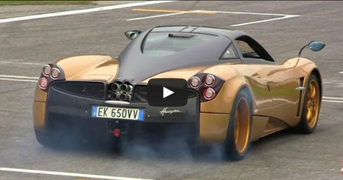 Due to its rarity, and the fact that each model is bespoke and built-to-order, seeing a new Pagani Huayra is quite an occasion. Here’s we have a spectacular gold Pagani Huayra, which is a marvelous spectacle on its own, but it’s better, because it is on a track, and it is being hooned mercilessly. Launch, acceleration runs, powerslides, it’s all hear.