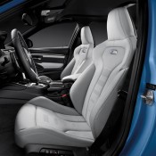 The new M3/M4 comes with an M bod kit designed not only for an aggressive look, but also optimum aerodynamic and cooling efficiency. The interior is typical BMW, with lots of M equipment details including M door sill finishers, an M driver’s footrest, M gearshift lever, M-design circular instruments with white graphics, M leather steering wheel with chrome trim, color contrast stitching and electroplated-look shift paddles (if the M-DCT gearbox is specified). It also comes with a lap timer app. The optional Head-Up Display in the BMW M3 and BMW M4 comes with additional, M-specific functions such as a gear display, rev counter and Optimum Shift Indicator.