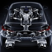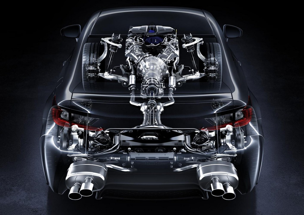 Lexus RC F’s sport suspension is complemented with a set of 19-inch forged aluminium alloy wheels and clever aerodynamics featuring an active rear wing to make the best of the engine’s performance. The active wing, inspired by the LFA super car, is also part of the car’s styling features, including large air intakes, a massive spindle grille, flared wheelarches, and a rear diffuser. The RC F is a prime example of form following function, as every single styling element contributes to the car’s performance.