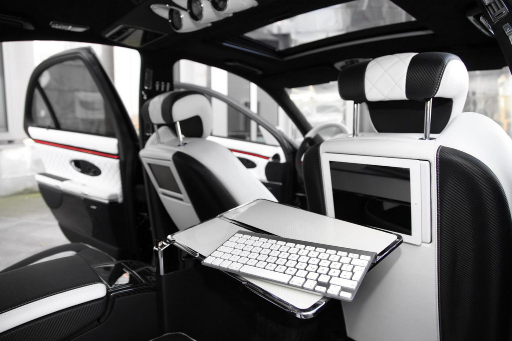 The most notable features of the Maybach 57S by Night Luxury – apart from rather magnificent carbon fiber body panels, all the leather, the 29-part white carbon, and the 39-part black carbon trim pieces –  include a sick entertainment system featuring iPads, Apple keyboards, Apple TV, and mobile LTE connectivity, plus a dashboard camera and a GPS tracking system.