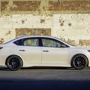 The answer is a lot. The car has a substantial styling kit, including a deep front fascia with lower LED lights and wide lower grille, wide lower front spoiler, fender flares, side sills, 370-style rear diffuser, deep-skirted rear fascia accentuated by large dual exhaust tips, and smoked lights. A Bright Pearl White paint job garnished with black chrome accents makes the carbon fiber kit stand out on the Sentra.