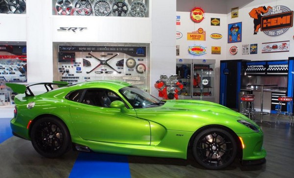 The new carbon fiber aero kit is also an interesting addition to the Stryker Green SRT Viper on display at NAIAS, featuring a Mopar carbon fiber rear wing and extended front corner splitters. IT makes the car look more racy, but we’re not sure it’s going to have that big an effect on its aerodynamic efficiency.