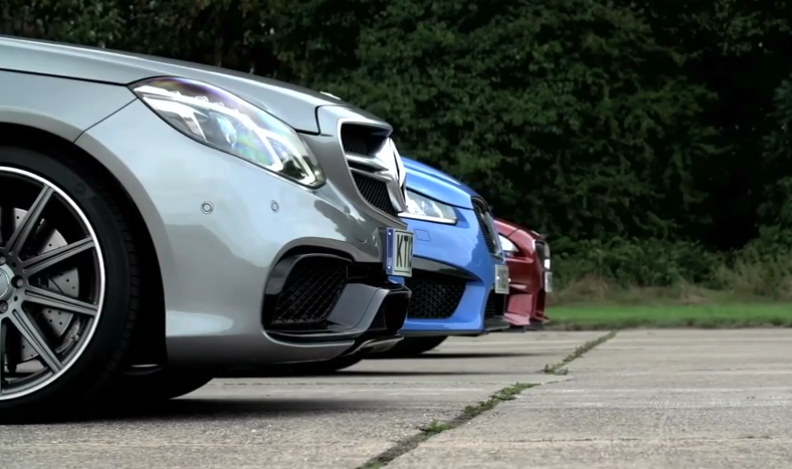 We have the Mercedes E63 AMG, the S-Model, which is normally four-wheel-drive but not in the UK; the absolutely gorgeous BMW M6 Gran Coupe which renders the M5 completely pointless; and the Jaguar XFR-S, which is just not as interesting as the other two. Fact.