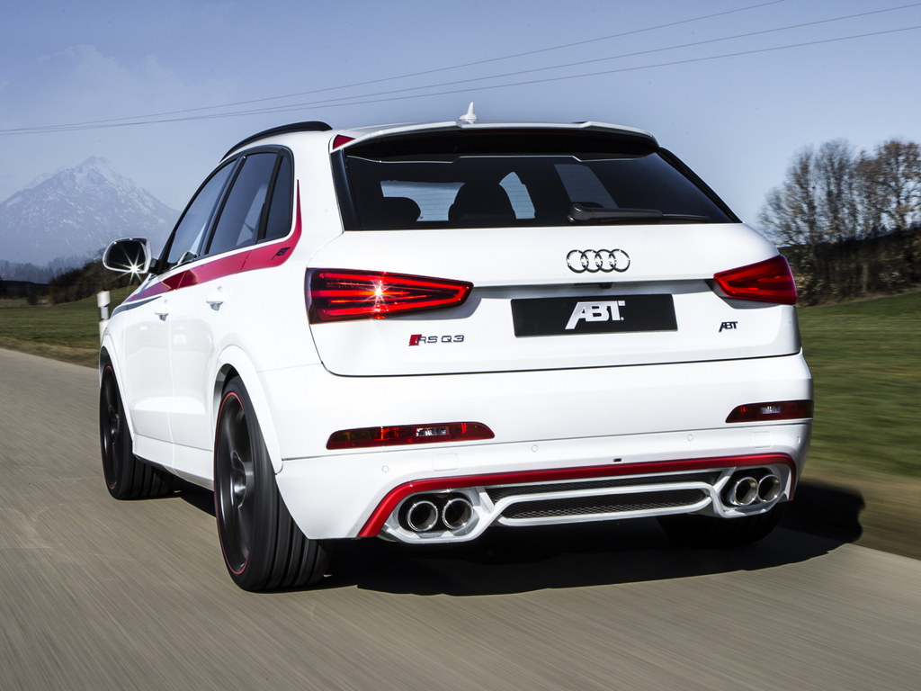 To make the car looks the part as well, ABT Audi RS Q3 is fitted with an aerodynamic styling kit consisting of revised front bumpers and grille, flared arches and rear diffuser complete with new tailpipes. The tuner has applied an interesting paint job to the show car as well, with a white base and black and red accents and stripes all over the body.