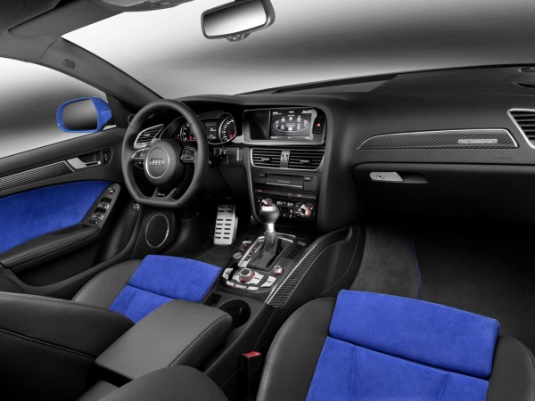 Audi RS4 Nogaro features 20-inch wheels in 5-V-spoke design, 265/30 series tires, and red-painted brake calipers bearing RS emblems, plus black Valcona leather with Alcantara accenting and blue stitching – also an RS2 homage. What’s more, the armrests are covered with black leather, with blue contrasting stitching providing accents. Black or nogaro blue piping frames the black floor mats.