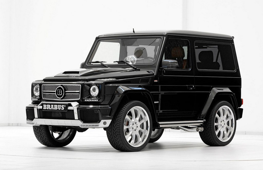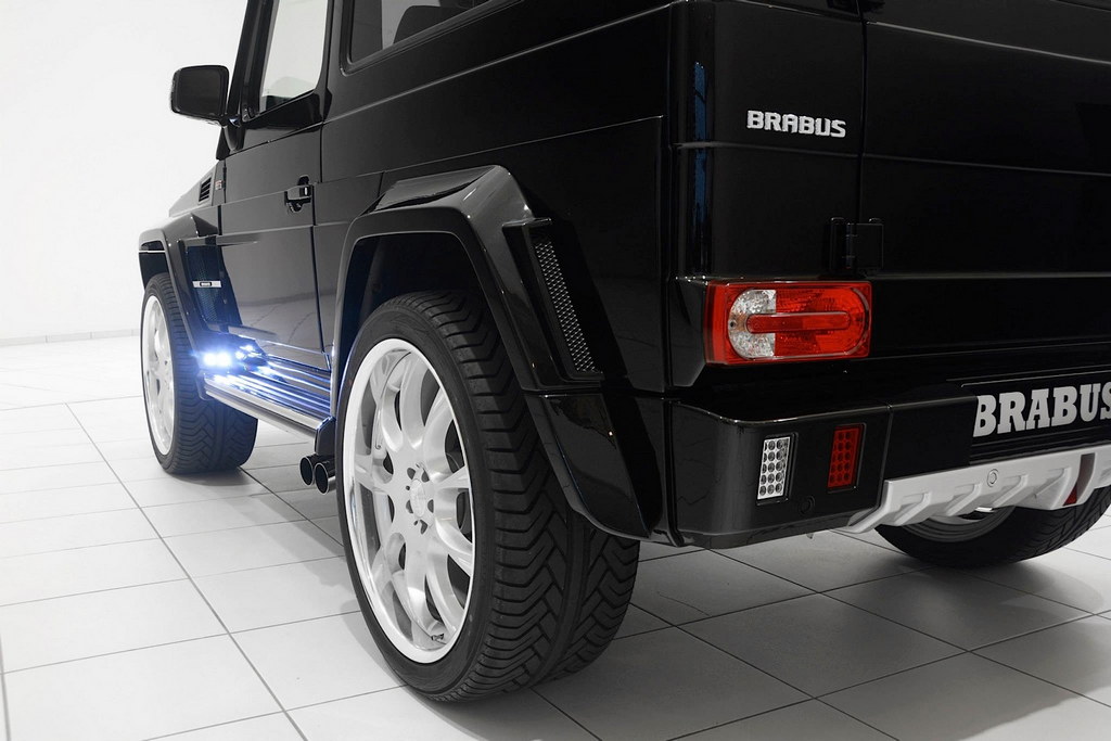 The styling kit on the Brabus Mercedes G500 SWB includes steel and silver accents for the front bumper, LED lights and blinkers, Brabus front grille, vented hood, fender extensions, steel running boards, new side exhaust pipes, and new rear bumper with a diffuser insert and unique LED lights.