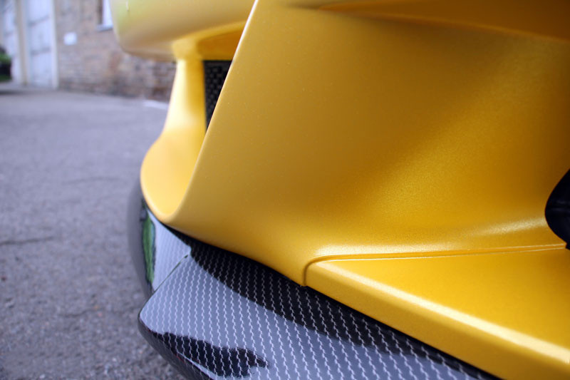 The main feature of Folsta’s M6 is the yellow wrap that gives the car a very bright, and somewhat overwhelming, shine. The yellow base is adorned with carbon fiber-look hood and front spoiler, and accentuated by the black canvas roof.
