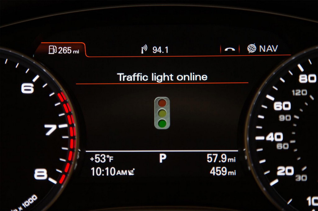 Audi says the online light information system has the potential to reduce CO2 emissions by up to 15 per cent, and could save approximately 900 million litres of fuel if it were to be deployed throughout Germany.