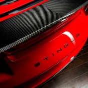 The ingredients of the Stinger recipe include unique front bumper with spoiler lip and air ducts, front fender extensions, two-part side skirts, rear fender widening, rear bumper with diffuser unit, rear spoiler, sport hood, and sport exhaust system.