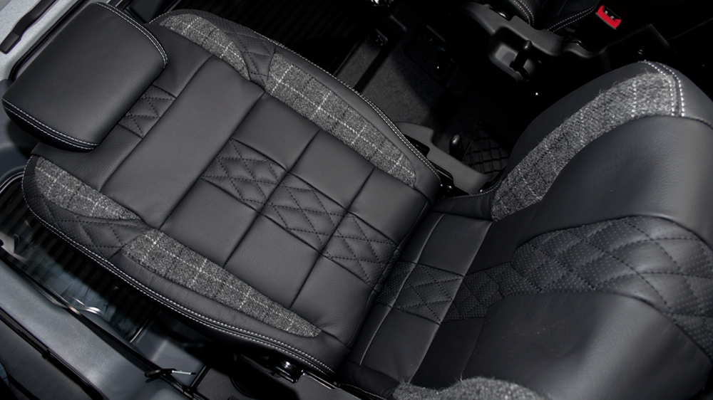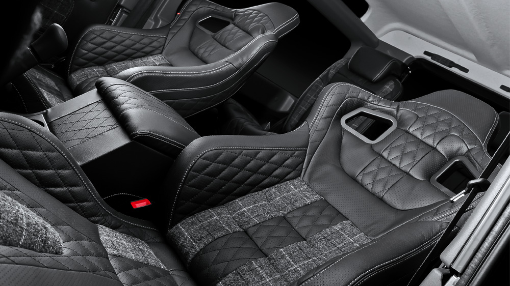 The interior package, although bespoke to the individuals, can include body-hugging seats in quilted and perforated leather, billet and leather steering wheel, Harris Tweed inserts and Kahn instruments. This particular Defender is based on the 2.2 liter TDCI diesel version.
