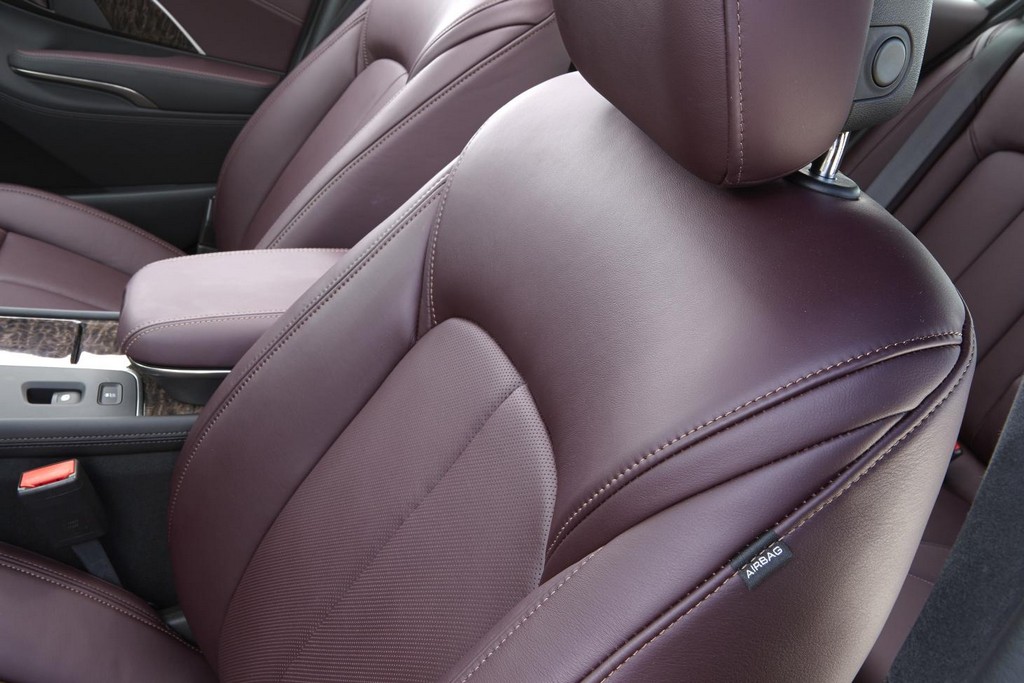 A 2014 Buick LaCrosse with Ultra Luxury interior package features front and rear seating upholstered in a rich, soft semi-aniline leather, dyed a deep sangria color, exclusive to Buick. Leather also covers the console and door armrests, but in ebony, creating a nice combo. The headliner meanwhile is finished in suede along with the pillars.
