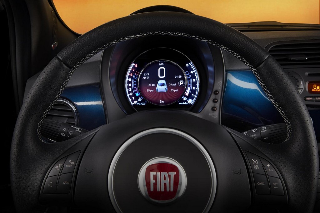 The highlight of the 2015 Fiat 500 interior is the addition of a new 7-inch TFT cluster that delivers vital information such as speed, fuel level, Eco index and trip information to the driver in an innovative and cool way.