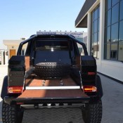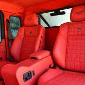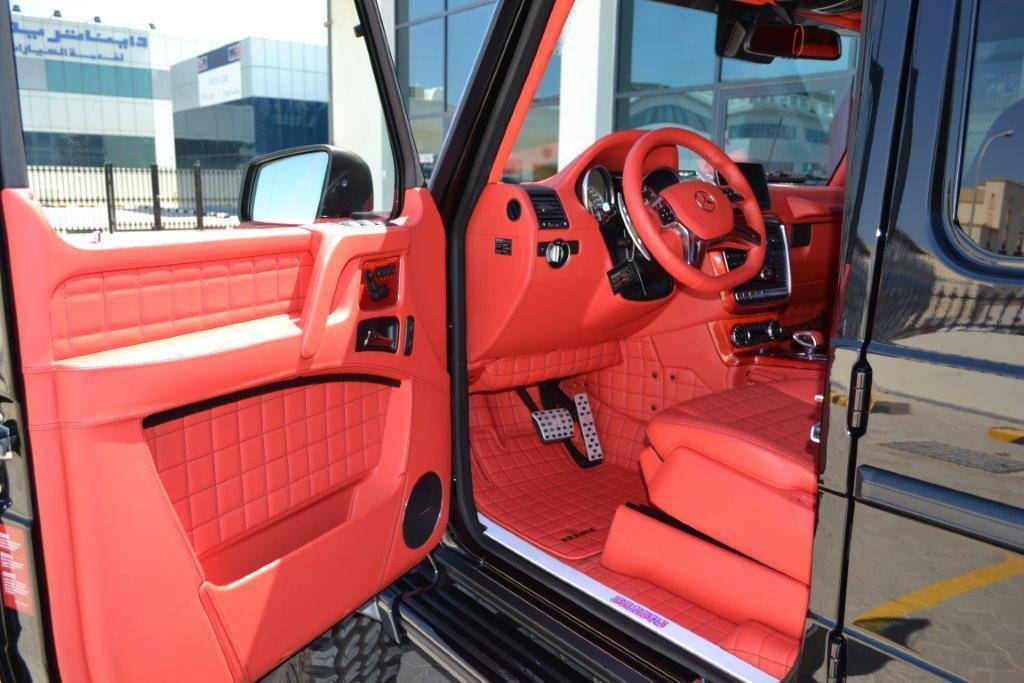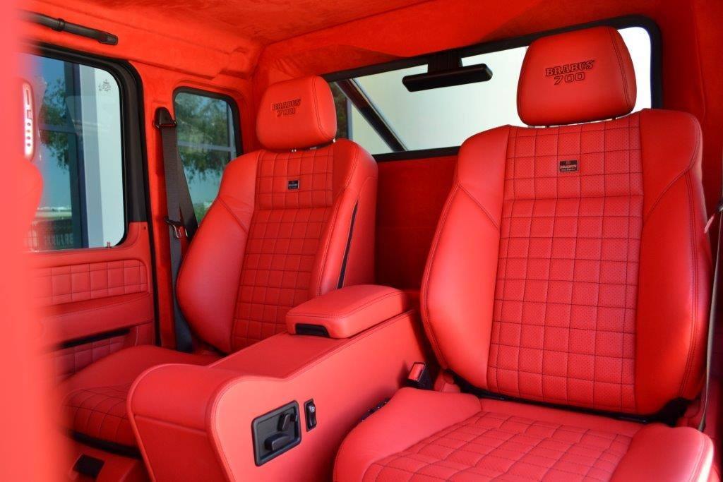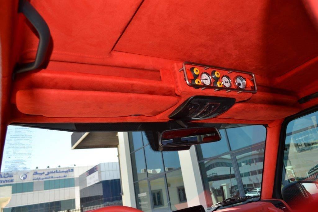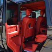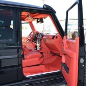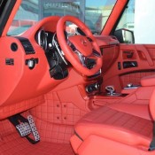 Visually, Brabus Mercedes G63 6×6 features revised bumpers with steel accents, Brabus grille, carbon fiber fender flares, gloss-finished guards and running borads, LED lighting and black chrome accenting. The interior is wrapped completely in fire red Mastik-leather, and further eahcned by Alcantara accents and carbon fiber inserts.