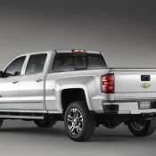 The 2014 Chevrolet Silverado Heavy Duty High Country models are easily distinguished over the standard version by the virtue of their chrome grille with horizontal bars, and body-color front and rear bumpers, 6-inch tubular chrome assist steps, 20-inch chrome wheels (17-inch in 3500 HD with dual-rear-wheel), and High Country badges on the doors and tailgate and High Country logos on the door sill plates.