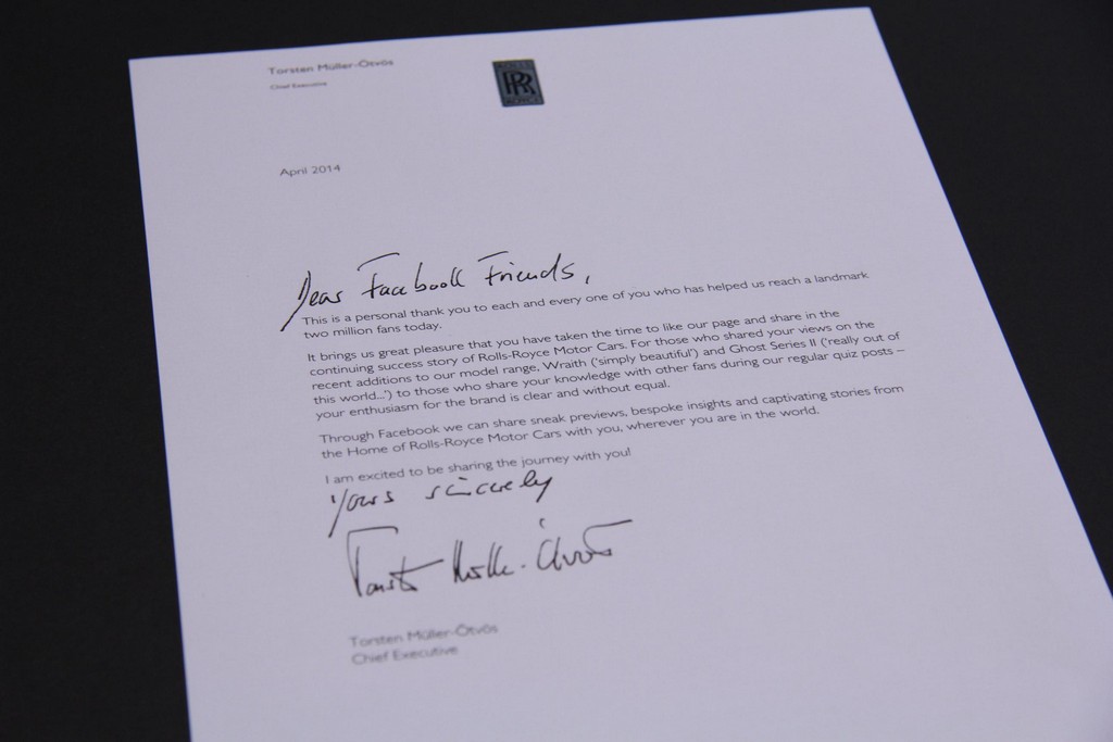 It is a special letter though, written personally by Torsten Müller-Ötvös, Chief Executive Officer of Rolls?Royce Motor Cars. In it he wrote: “Thank you to each and every one of you who has helped us reach a landmark two million fans. Through Facebook we can share sneak previews, bespoke insights and captivating stories from the Home of Rolls-Royce Motor Cars with you, wherever you are in the world. I am excited to be sharing the journey with you!”