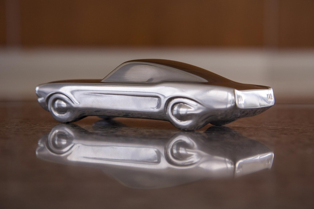 The sculpture immortalizes in aluminum a 1965 Ford Mustang Fastback, the original model and the only truly desirable version; the reason the car has become so famous. Bark first created the prototype in clay, then resin, and then in aluminum. The unique shape of the Mustang turned out to be a challenge, but Bark only wanted the profile to be recognizable as a Mustang and didn’t care much for details.