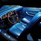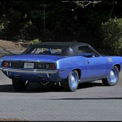 This 1971 Plymouth Hemi Cuda Convertible is a fully restored example and retains mostly all of its original sheet metal. The color and the interior trimming are also restored to the original settings. Among its most notable features we can mention painted steel wheels, dog dish hub caps and white-letter tires, Shaker hood, hold-down pins and chromed dual exhaust tips, Rallye Instrument Cluster, and Hurst Pistol Grip shifter.